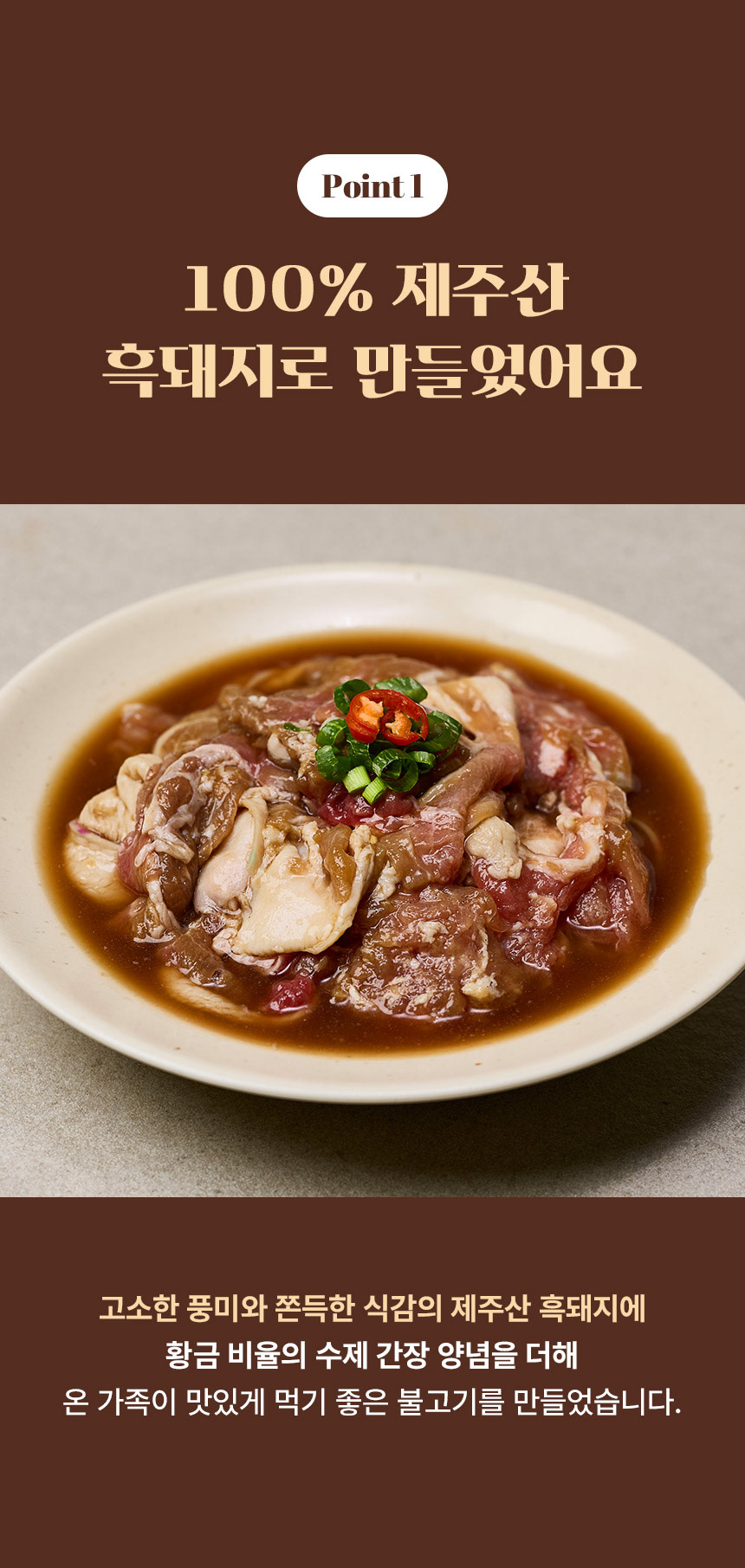 푸드대통령의 간장불고기 상세페이지 디자인입니다. 전체적으로 따뜻하고 고급스러운 브라운 계열을 사용하여 식욕을 자극하면서도 신뢰감을 주는 무드로 디자인하였고, 미니멀한 구성과 직관적인 레이아웃으로 핵심 정보에 집중해 소비자 이해도를 높였으며, 스크롤 흐름에 따라 제품의 매력을 효과적으로 전달할 수 있도록 구성하였습니다.