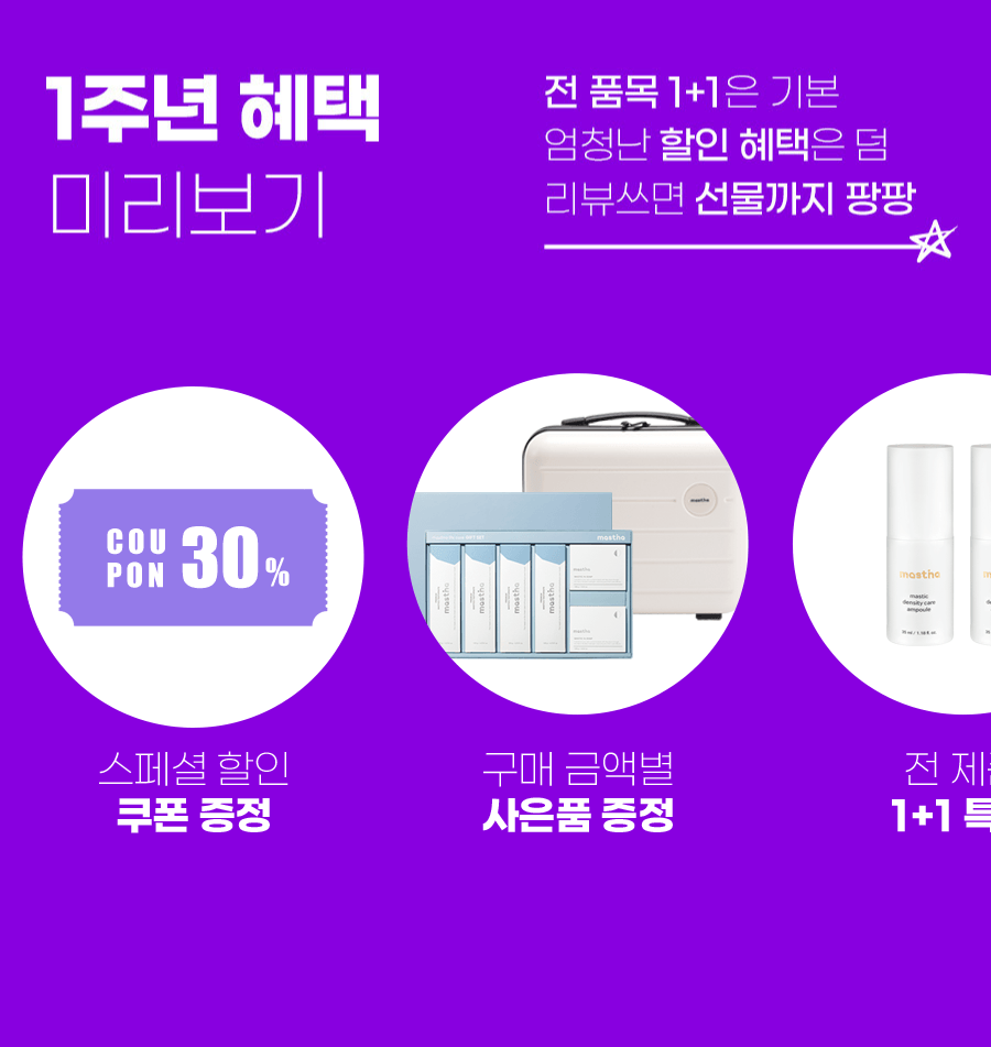 1주년 기념으로 다양한 혜택과 경품이 한눈에 보여질 수 있게 디자인하였으며, 심플리 스크롤을 활용하여 각 혜택이 오토 스크롤되면서 혜택 섹션 별로 바로 이동 할 수 있도록 작업하였습니다.