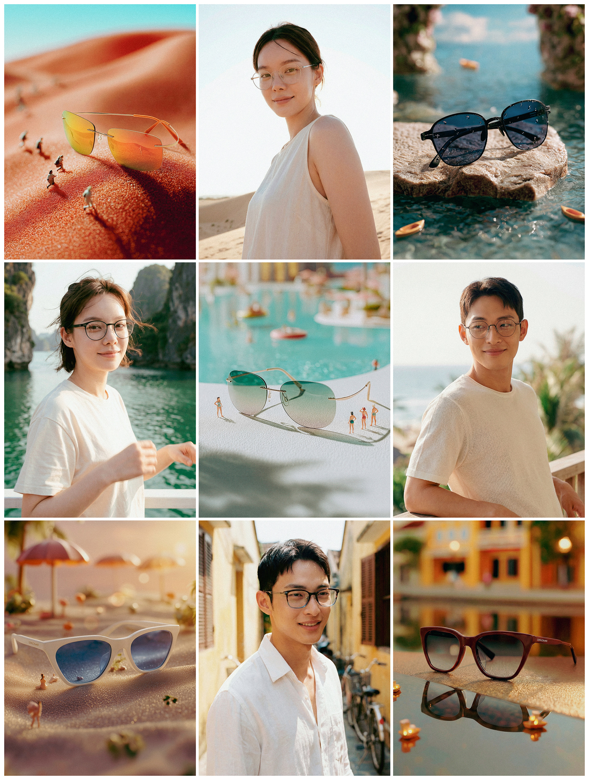 C SQUARE 아이웨어 스토어의Tết 연휴 시즌 비주얼 작업입니다. 베트남의 최대 연휴를 맞아 대표적인 관광지를 배경으로, 디오라마 스타일의 제품 컷과 내추럴 라이프스타일 인물 컷을 믹스해 이국적인 휴양지 무드를 담은 비주얼을 제작했습니다. 제품 컷에는 미니어처를 활용해 스케일 대비에서 오는 위트와 시각적인 재미를 더했으며, 인물컷은 인위적인 포즈를 배제하고 자연스러운 시선과 동작을 중심으로 여행지 특유의 여유로운 분위기를 담아냈습니다.
