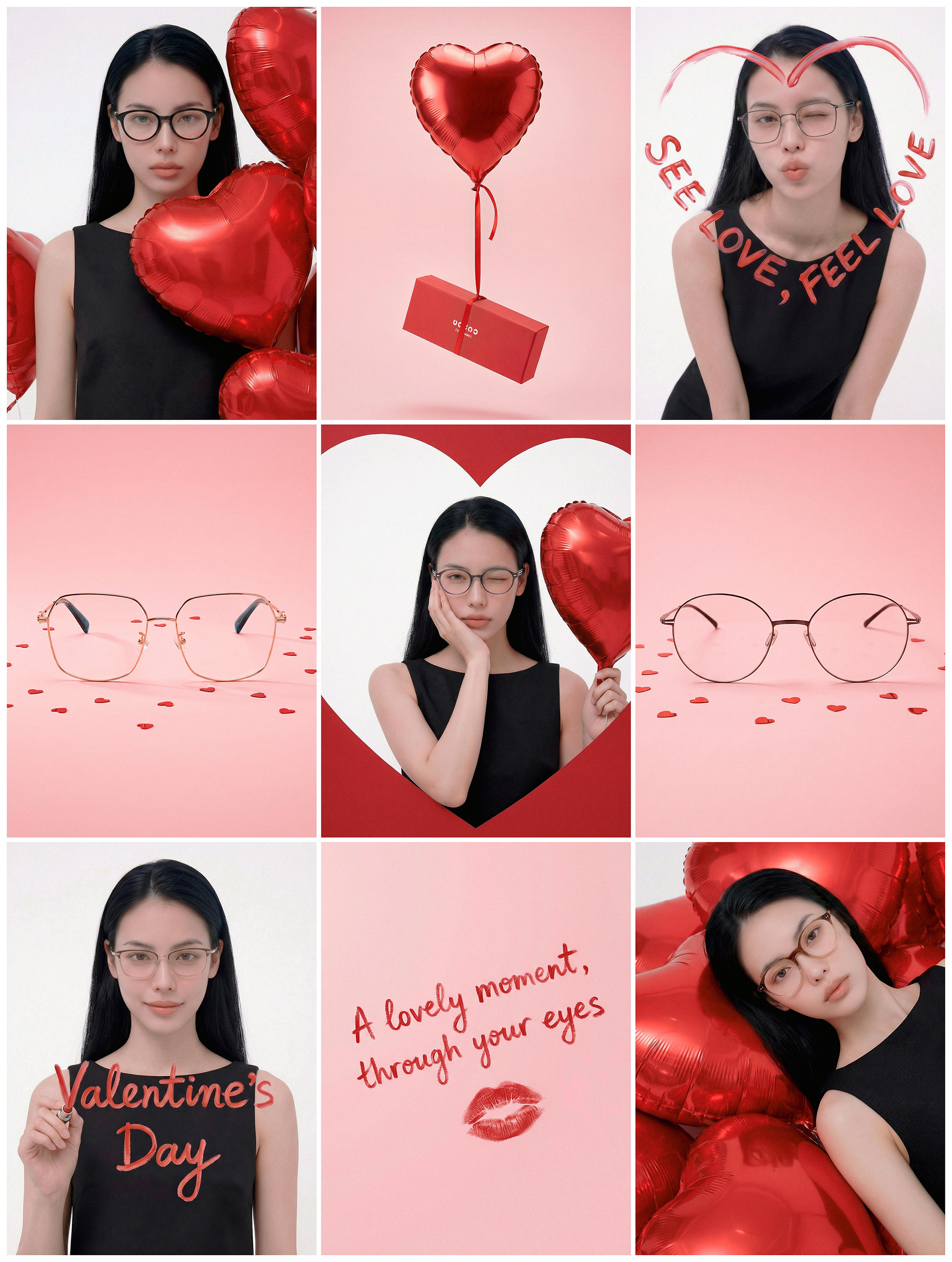 C SQUARE 아이웨어 스토어의 발렌타인데이 시즌 비주얼 작업입니다. "SEE LOVE, FEEL LOVE" 메시지처럼, 이번 작업은 사랑을 보고 느끼는 감각적인 경험을 붉은 하트 벌룬과 로맨틱한 핑크 톤의 무드로 시각화했습니다. 세련된 블랙 룩과 대비되는 따뜻한 프레임들을 통해, 차분한 공간감 속에서 발렌타인 시즌의 설렘이 선명하게 체감되는 무드 페이지를 제작했습니다. 발렌타인데이 특유의 로맨틱한 감성을 유지하면서도, C SQUARE 아이웨어가 지닌 미니멀하고 세련된 브랜드 아이덴티티가 자연스럽게 드러나도록 구성한 시즌 비주얼입니다.