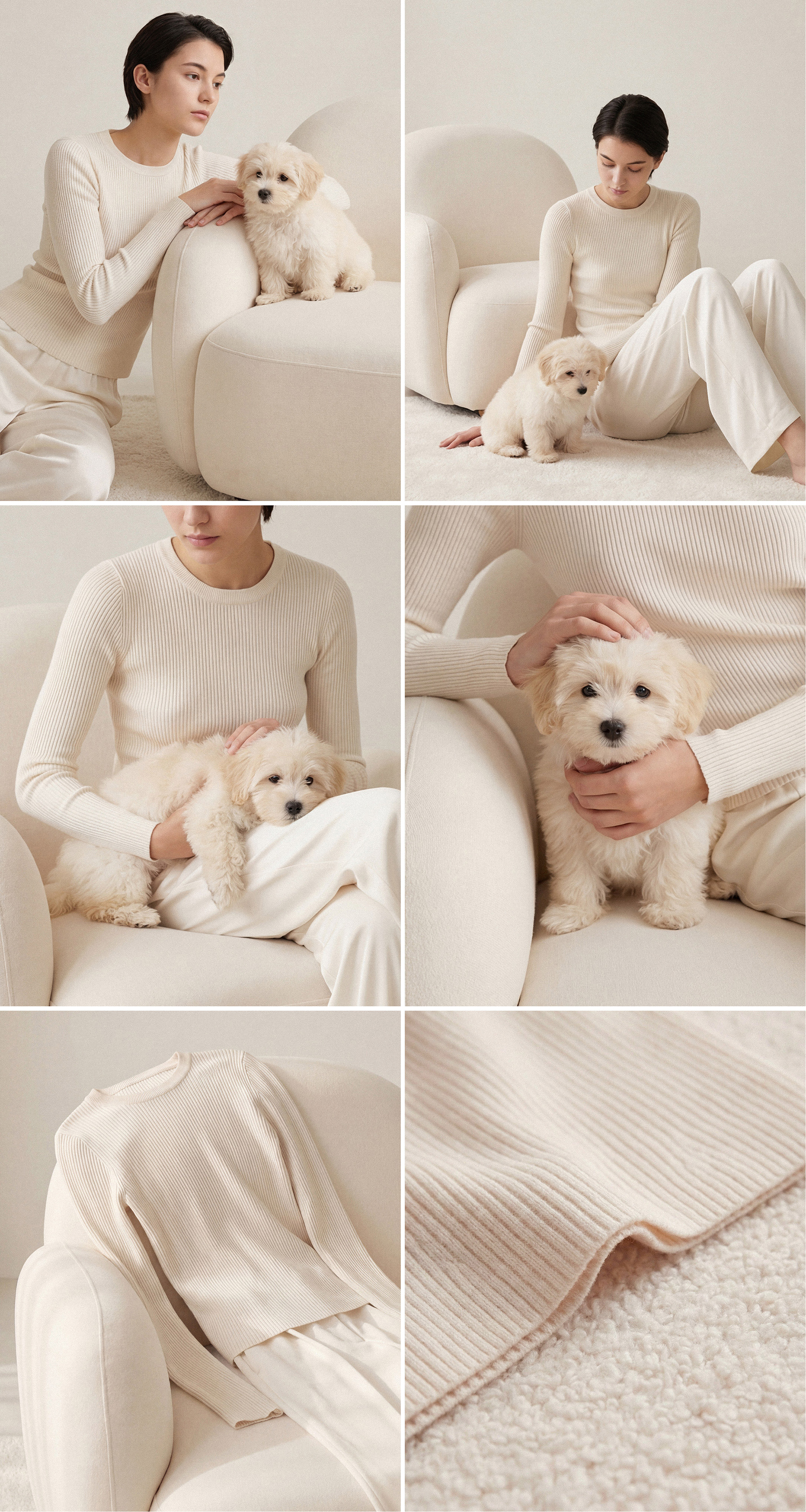 Soft Rest in Cream, Tone on Tone, and Warmth. 시선마저 따뜻하게 감싸는 크림 톤온톤. 니트와 강아지, 그리고 포근한 텍스처의 조화. 닿는 순간 느껴지는 온전한 평온함. 가장 부드러운 휴식의 순간을 담았습니다. 이 에디토리얼은 ‘휴식’을 감정적으로 설명하기보다, 시각적 요소만으로 전달할 수 있는지에 대한 질문에서 출발했습니다. 색의 대비를 최소화한 크림 톤온톤 안에서, 연출보다는 소재의 질감과 화면의 거리감에 집중하는 방식으로 접근했습니다. 니트, 패브릭 소파, 강아지의 털처럼 서로 다른 부드러움을 가진 요소들을 하나의 장면에 배치해 시선으로 촉감을 느끼는 경험을 만들고자 했습니다. 이를 통해 ‘힐링’을 직접적으로 말하지 않으면서도, 가장 부드러운 휴식의 한 순간이 자연스럽게 전달되길 의도했습니다.
